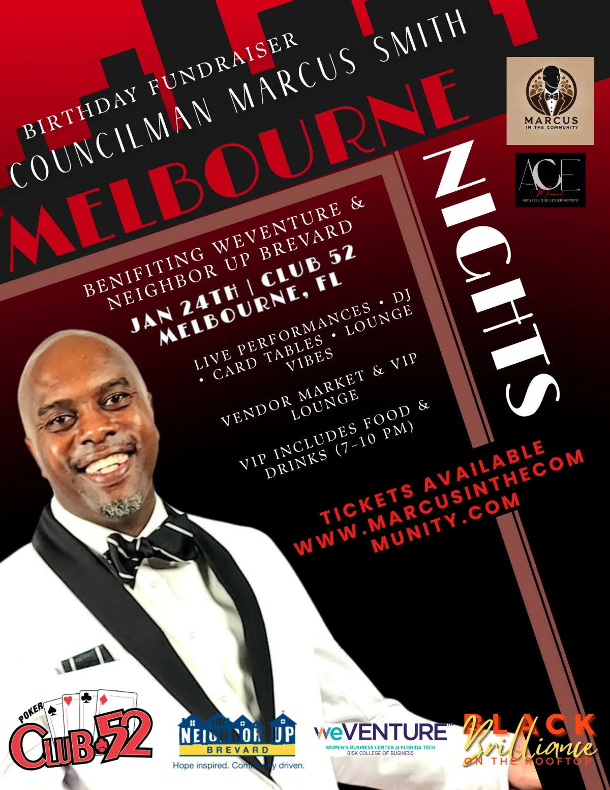 In celebration of his birthday, Marcus Smith is turning joy into impact with a special fundraising event benefiting two powerful community organizations: weVENTURE and Neighbor Up Brevard. This one-night experience, produced in partnership with Black Brilliance on the Rooftop, brings together purpose, entertainment, and generosity — all in honor of Marcus’ commitment to community uplift. Proceeds from the evening will directly support local programs focused on empowerment, entrepreneurship, and neighborhood revitalization, turning a personal milestone into a moment of shared progress for Brevard County.