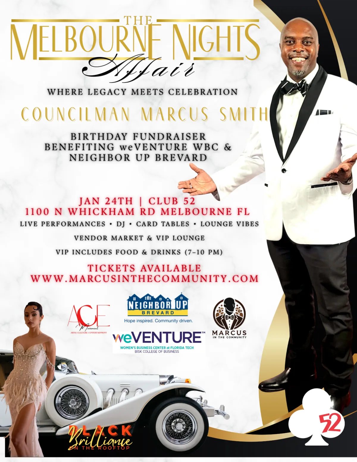 In celebration of his birthday, Marcus Smith is turning joy into impact with a special fundraising event benefiting two powerful community organizations: weVENTURE and Neighbor Up Brevard. This one-night experience, produced in partnership with Black Brilliance on the Rooftop, brings together purpose, entertainment, and generosity — all in honor of Marcus’ commitment to community uplift. Proceeds from the evening will directly support local programs focused on empowerment, entrepreneurship, and neighborhood revitalization, turning a personal milestone into a moment of shared progress for Brevard County.