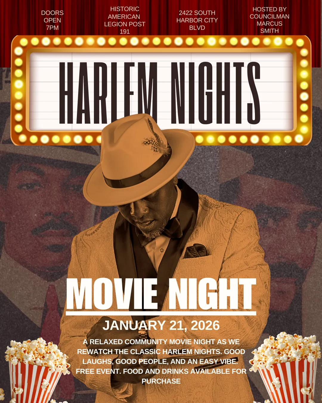 Join us for a screening of the classic comedy Harlem Nights on Wednesday, January 21, 2026. Doors open at 7 PM at the Historic American Legion Post 191. Enjoy laughs, fellowship, and a relaxed community vibe. Food and beverages available for purchase.